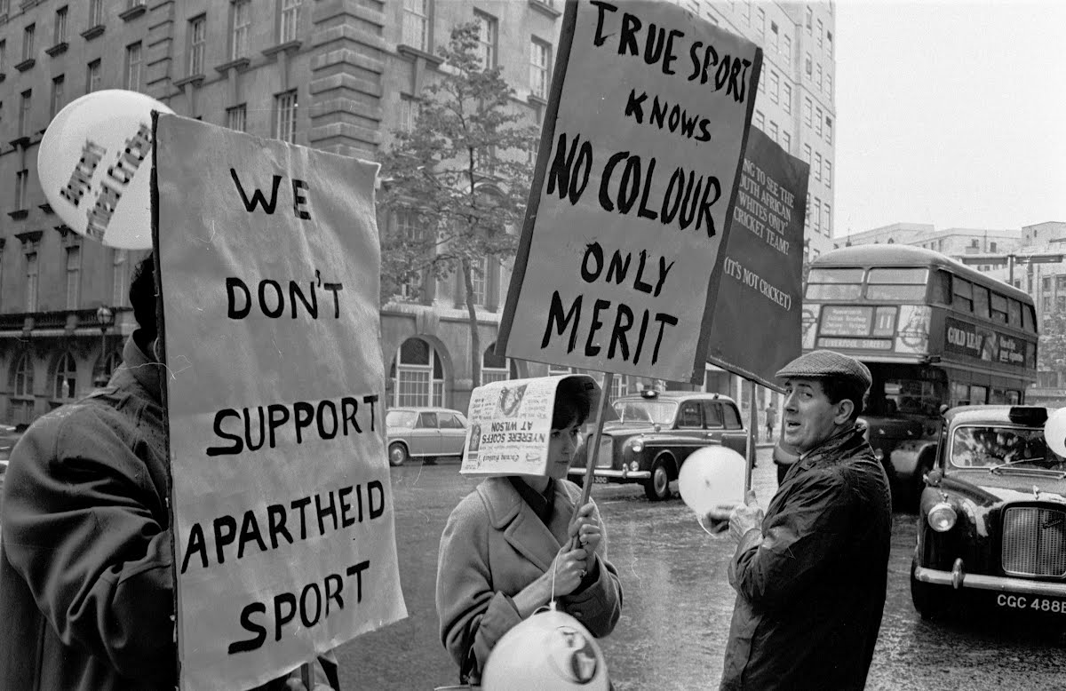 Anti-Apartheid Movement supporters asked spectators to boycott the Springboks v Glamorgan cricket match at St Helen’s, Swansea, 31 June 1965 (literally via).